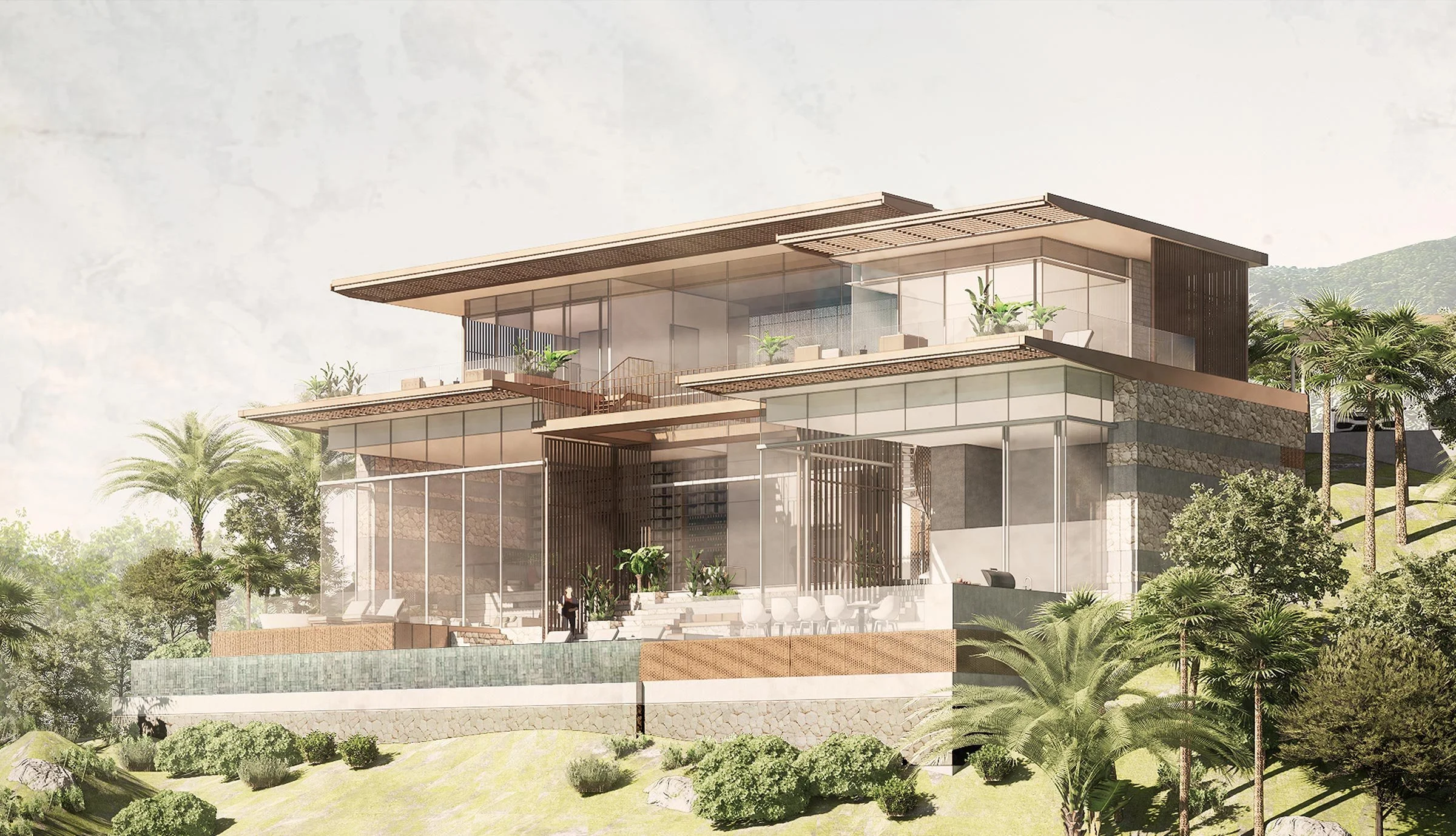 The designs for a sea-view villa in Koh Phangan harmonize with the unique hillside setting. The pool serves as a central spatial element, seamlessly integrating with a series of cascading spaces that mediate between architecture and the natural landscape
